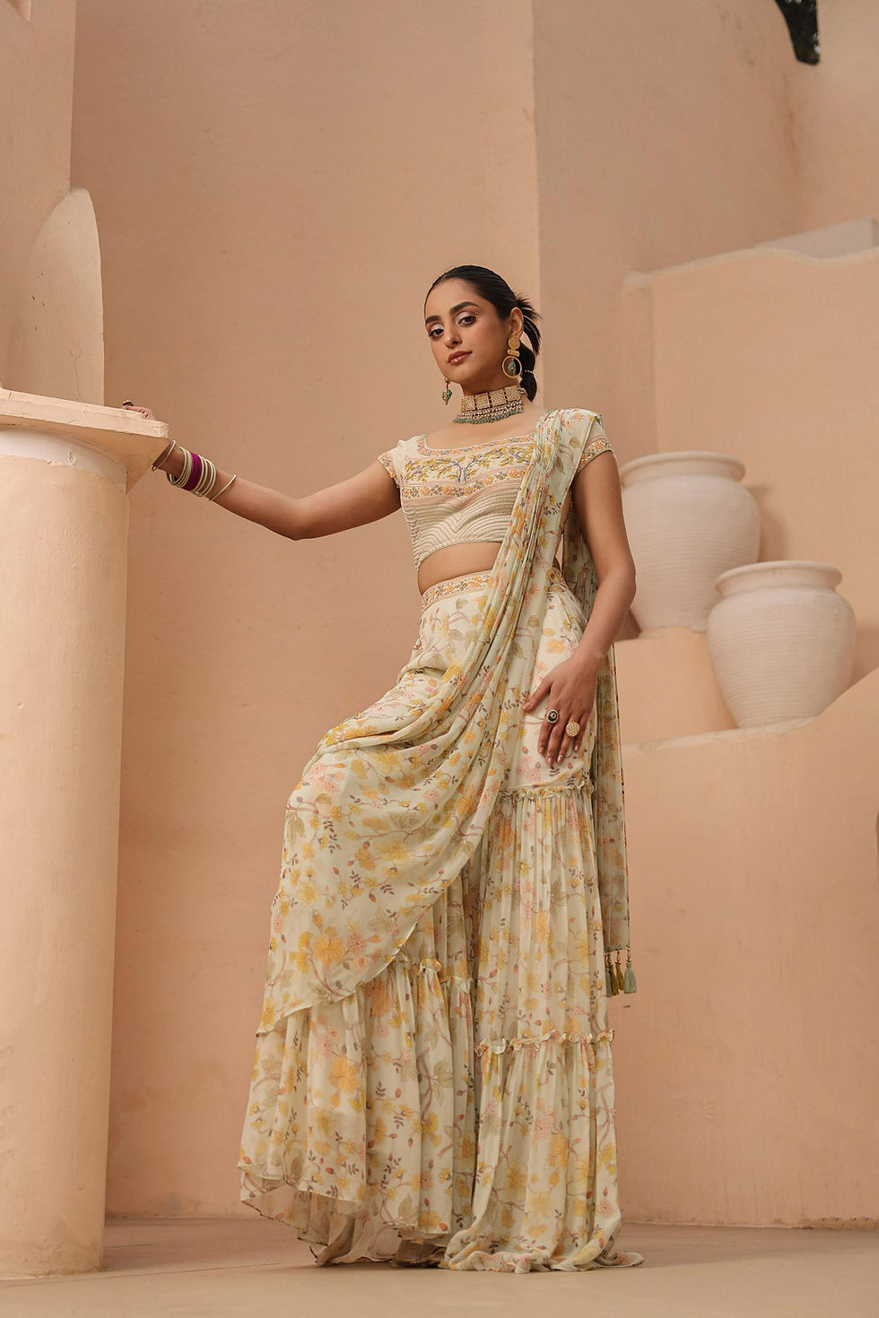 Classic Ivory Floral Printed Premium Georgette Silk Drape Saree